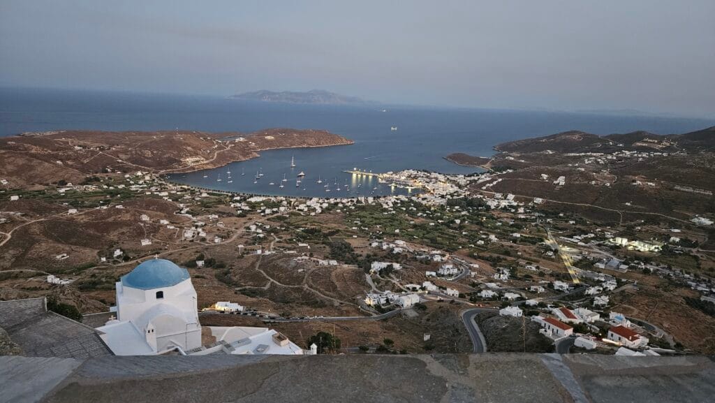 באי סריפוס – קחו מונית לעיר חורה, קחו אויר וטפסו ברגל את המדרגות בסימטאות עד לכנסיה למעלה, עם התצפית המרהיבה על המפרץ.